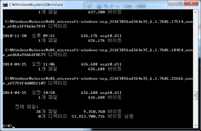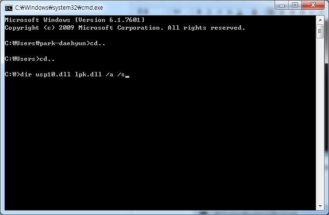 dir usp10.dll lpk.dll /a /s 입력하고 엔터.