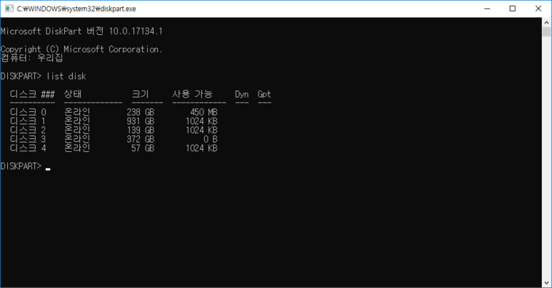 명령 프롬포트 창에서 diskpart를 입력하시면 디스크관리자가 실행됩니다.