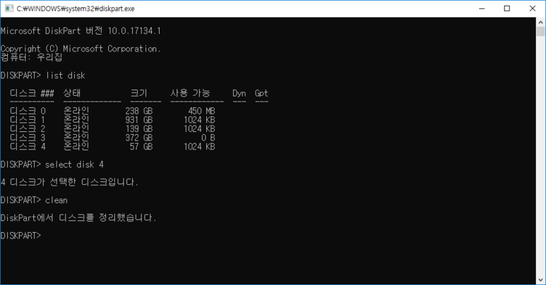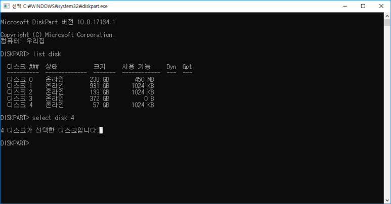 select disk #(#은 해당되는 번호. 저는 4번디스크를 초기화하겠습니다)