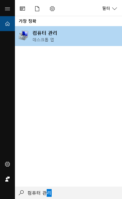 윈도우 + R키 또는 시작프로그램창에서 컴퓨터 관리를 입력.