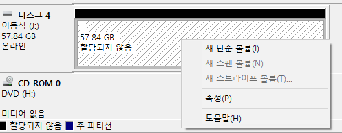 3. 위의 방법으로도 디스크가 복구되지않거나 새 단순 볼륨이 눌러지지 않는 경우.