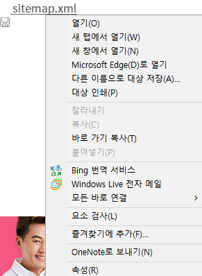 발행된 글을 보시면 sitemap.xml이 포스팅된 글에 나타나게 됩니다. 마우스를 가져가서 대시고 마우스 오른쪽 클릭.