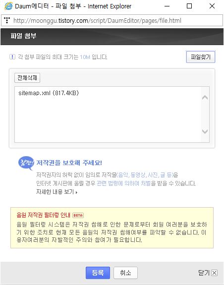 글쓰기 상단 메뉴에서 파일 첨부를 클릭하시고 다운로드 받은 사이트맵을 업로드합니다. 그 후, 비공개로 글을 발행하시면 되겠습니다.